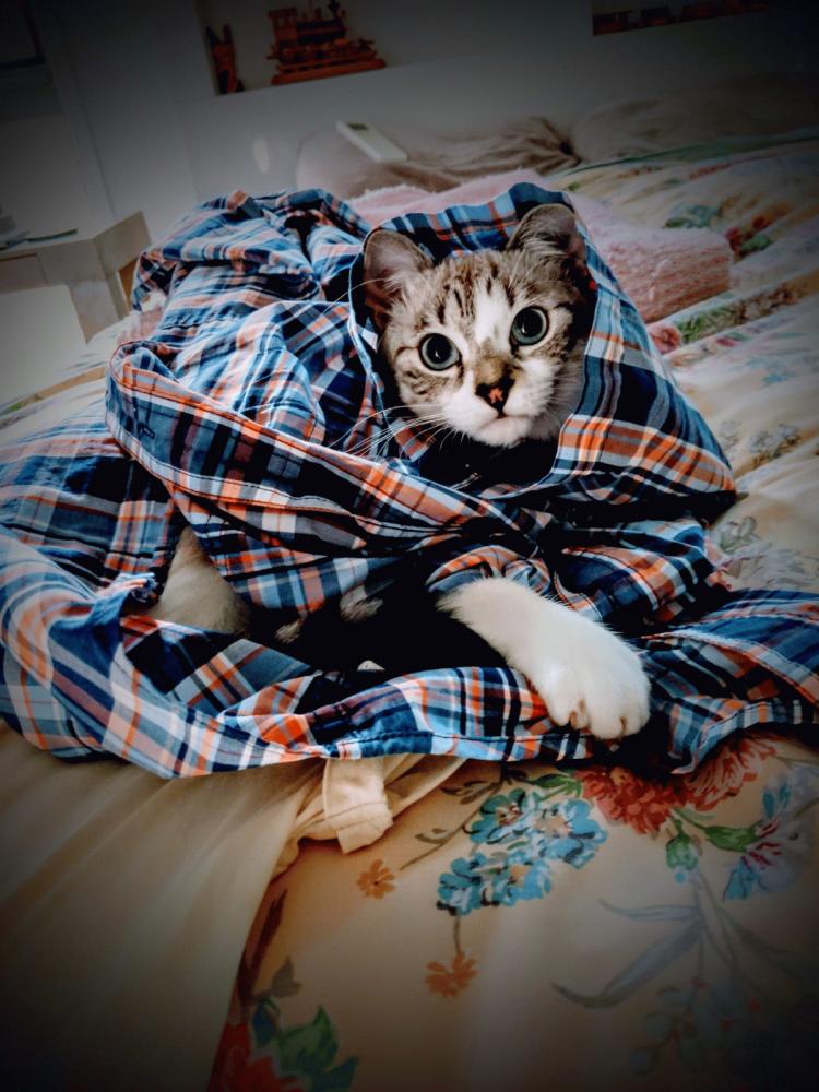I laid this shirt on the bed, and somehow she managed to try it on.