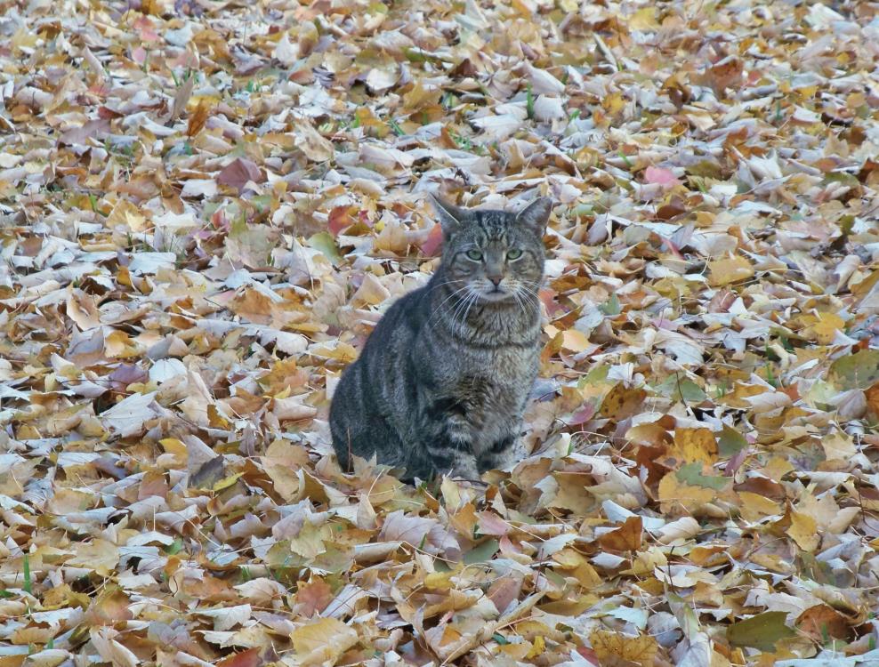That's a terrific photo! The cat stands out against the leaves, yet matches the natural feeling of the pic.