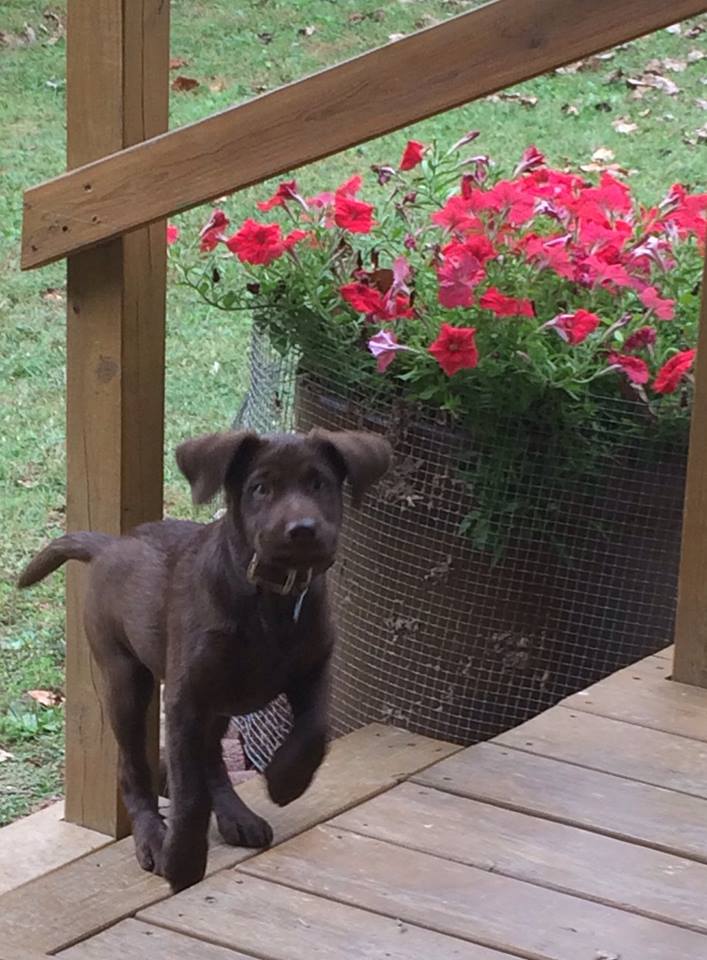 They look happy to see you, too! And nice contrast with the red flowers behind the doggy, great color combo. What's the puppy's name?