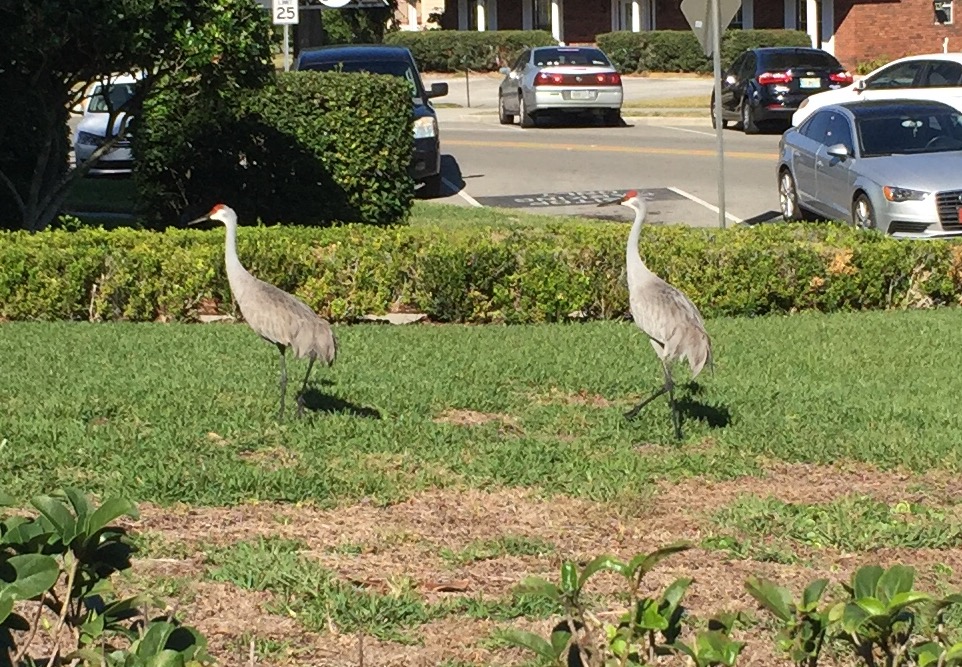 They are Sandhill Cranes and protected under Florida Law. I have a couple that come and visit in my yard all the time. I have been waiting for them to bring some babies around but nothing yet.