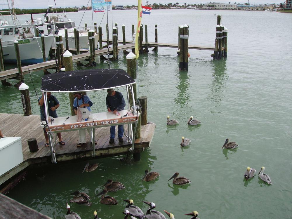 PELICANS FEAST ON FISH PARTS AS FISH ARE BEING CLEANED..