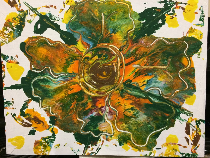 You can just pour paint on the canvas or what I did on this one is cut the bottom off of a plastic drink bottle, center it on the canvas, water paint down a bit and pour the layers of paint on the bottle. It runs down the grooves onto the canvas. When you have the colors you want, remove bottle, put cling wrap plastic over the paint you poured and move the paint where you want it to go then carefully remove the plastic.