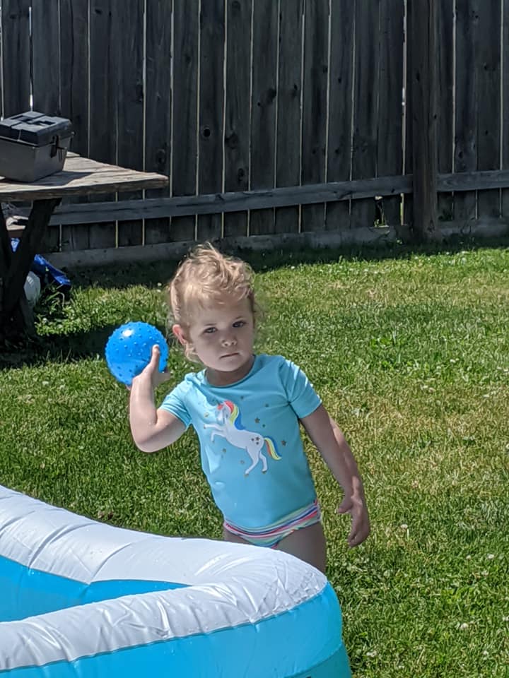 my great grand daughter throwing to her baby sister