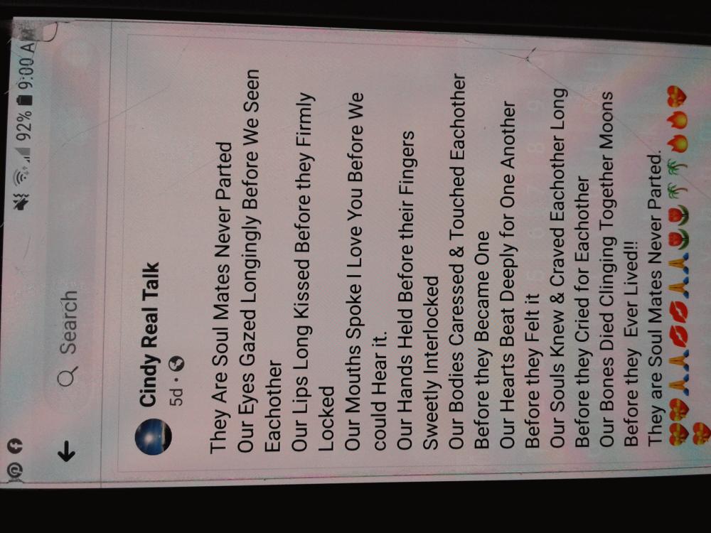 Aaawww GinnyB so glad it means as much to you as it does me! I'm so sorry you lost him! That has to be tough when it was your soul mate. Soul mates are extremely special! Nothing like them! I wrote this poem for exactly my Love here. I met mine 20 years ago on a yahoo site in a game of pool. And we played a couple other sites & here too! Thank you for reading my poem. I write alot and have them on my page Cindy Real Talk on fb. God Bless You GinnyB.